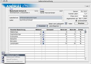 In diesem Abschnitt wird beschrieben wie Sie in ANIMAL-office Laborbefunde anzeigen, Werte aus mehreren Befunden miteinander vergleichen und wie Sie einen Laborbefund ausdrucken können. Führen Sie die folgenden Schritte durch um einen Laborbefund anzuzeigen:
