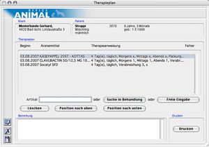 ANIMAL-office prüft ob für diesen Patienten bereits ein Therapieplan vorhanden ist und zeigt diesen gegebenenfalls an. Ist noch kein Therapieplan vorhanden übernimmt ANIMAL-office die abgegebenen Artikel der letzten Behandlung in den Therapieplan und zeigt diesen an.