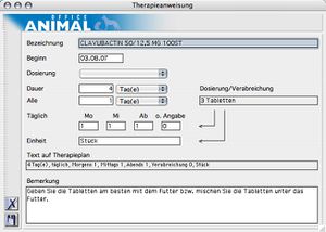 Zu den Hauptaufgaben von ANIMAL-office gehört es, die Servicefunktionen für die Tierbesitzer ständig zu erweitern. Der Ausdruck eines Therapieplans stellt für den Tierbesitzer eine sehr angenehme Unterstützung bei der Verabreichung der mitgegebenen Medikamente dar. Der Tierbesitzer erhält in Form des Therapieplans eine exakte Anleitung wie er seinem Haustier die abgegebenen Medikamente zu verabreichen hat und zwar über den gesamten Therapiezeitraum.